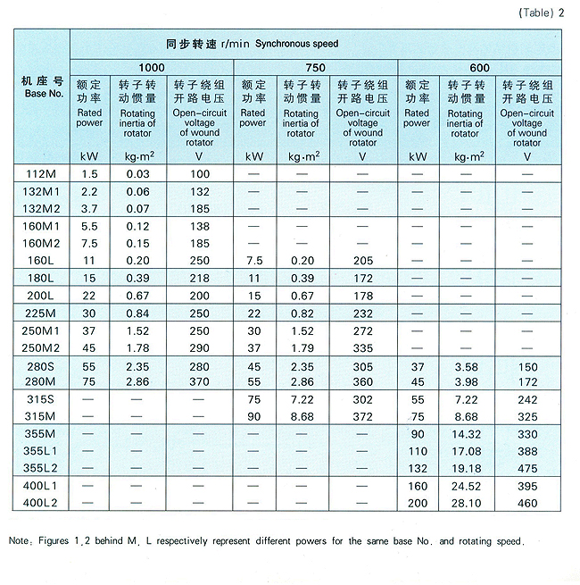 | Note:Figures1,2 behind M、L respectively represent different powers for the same base No. and rotating speed. |