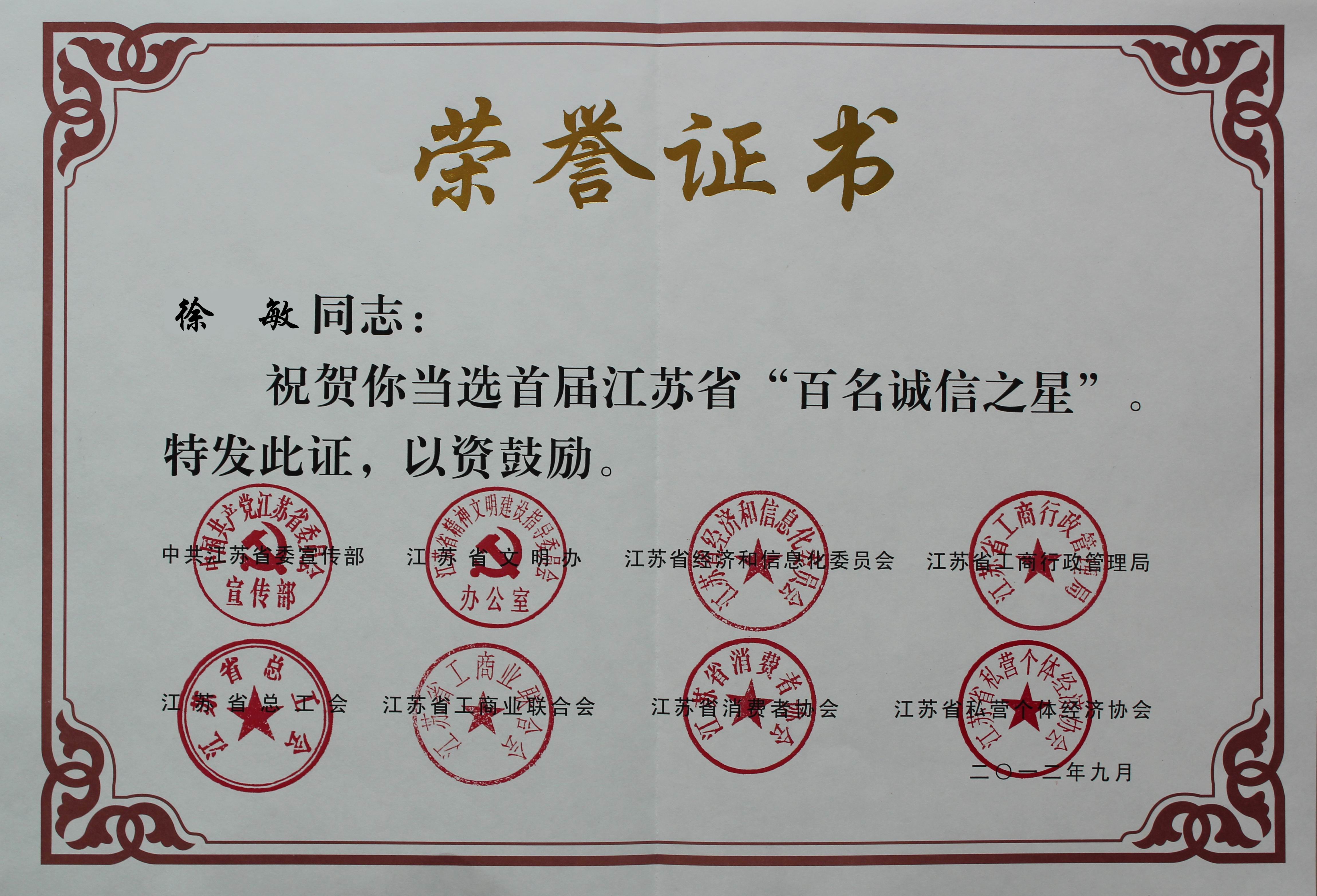 热烈庆祝徐敏总经理荣获江苏省“百名诚信之星”称号
